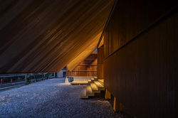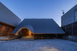The large roof extends seamlessly into the approach, its edge softly lifted to form a gentle curve. This gesture creates an in-between space that connects exterior and interior. The deep eaves receive light and shadow, forming a quiet threshold that leads visitors into the architecture.