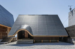 アプローチへと連続する大屋根は、端部を持ち上げたような柔らかな曲線を描き、内外をつなぐ「間」として機能する。
